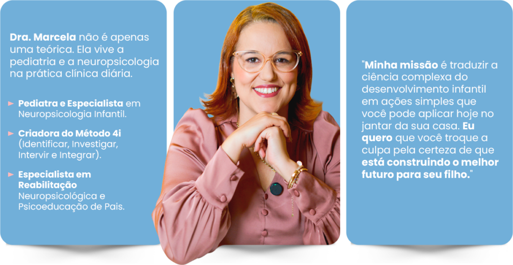 Aqui, Dra. Marcela Andrade (Pediatra e Especialista em Neuropsicologia) traduz o funcionamento do cérebro infantil em ferramentas práticas para o seu dia a dia.